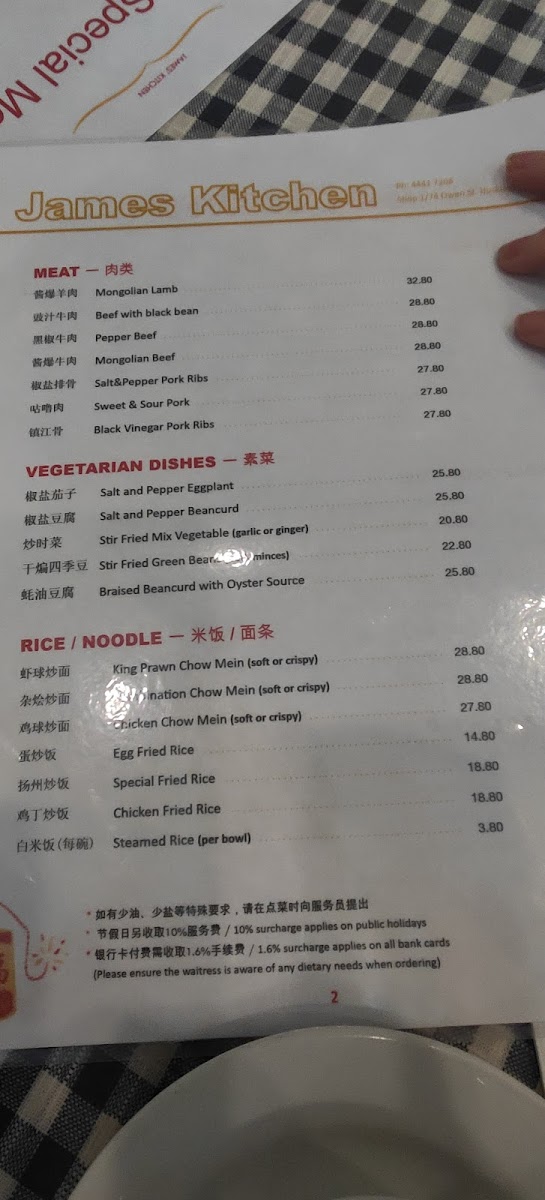 “ James kitchen has seating indoors and out. You are warmly welcomed by a staff; the restaurant is a family run business. Staff are happy to suggest and recommend dishes that complement each other. The menu is relatively simple though surprisingly tasty. Dumplings appear home made and fresh. The combo crispy chow mein has a good blend of textures and flavours - crunchy noodles with tender prawns, beef and chicken. There is a chef's menu available as well. Servings are good and won't leave you hungry. Parking is along the street in front of the restaurant. ”